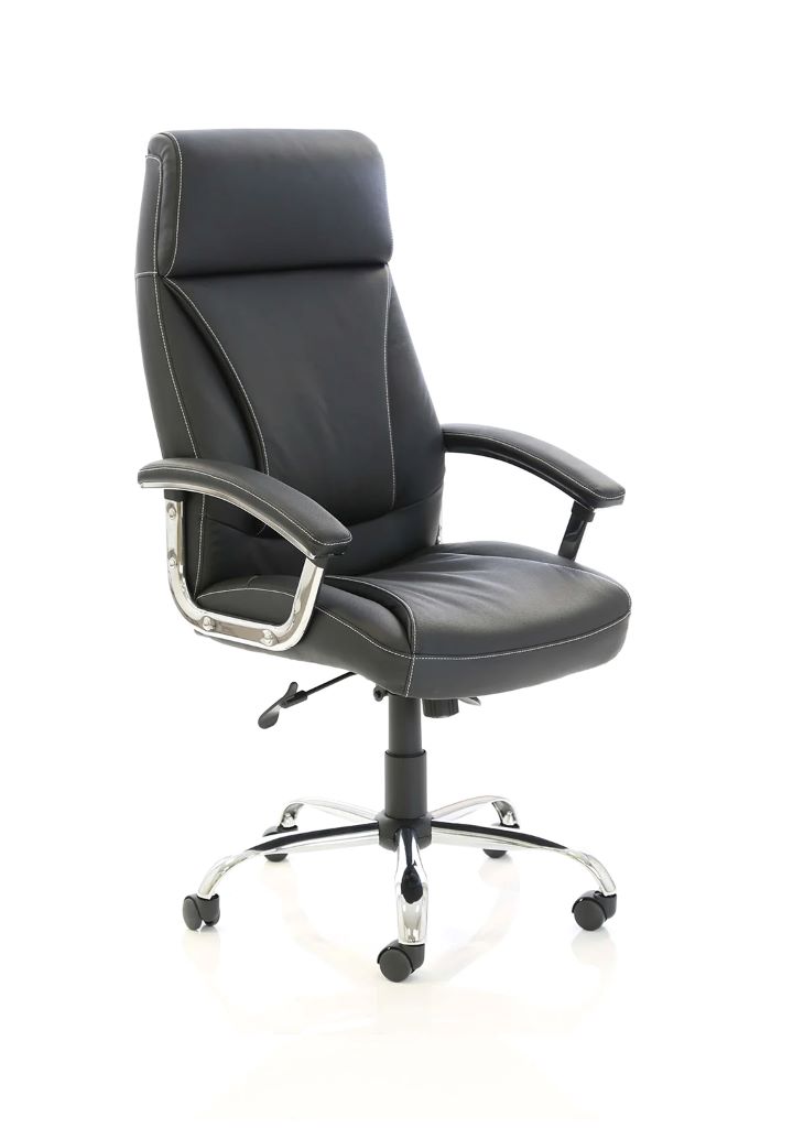 A luxurious bonded leather and chrome executive chair with comfort pads, tilting action and stylish stitching detail. Integral padded headrest.